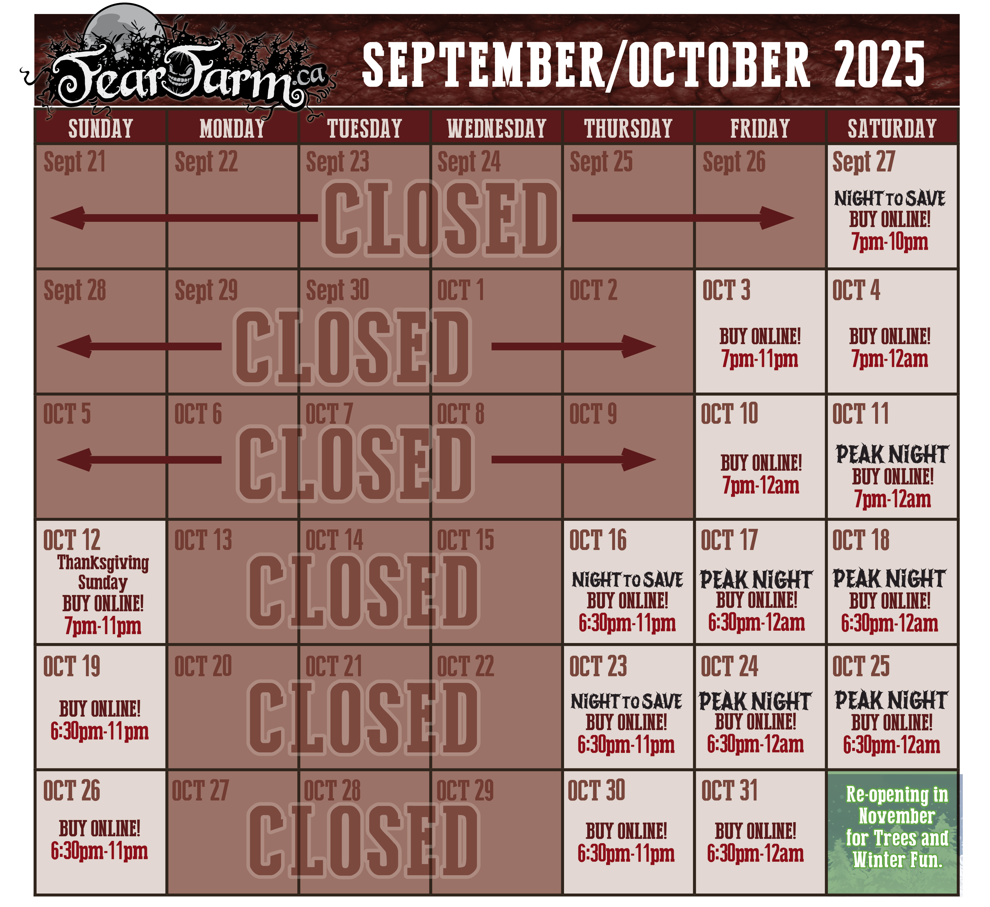 Visit Fear Farm during the 2025 season and experience the world-famous Haunted Hayride and 7 legendary haunts. With terrifying live actors, immersive sets, six food venues, and a one-of-a-kind gift emporium, this is more than just a haunted house, it's the ultimate halloween experience. All tickets must be purchased online in advance, no ticket sales at the door.